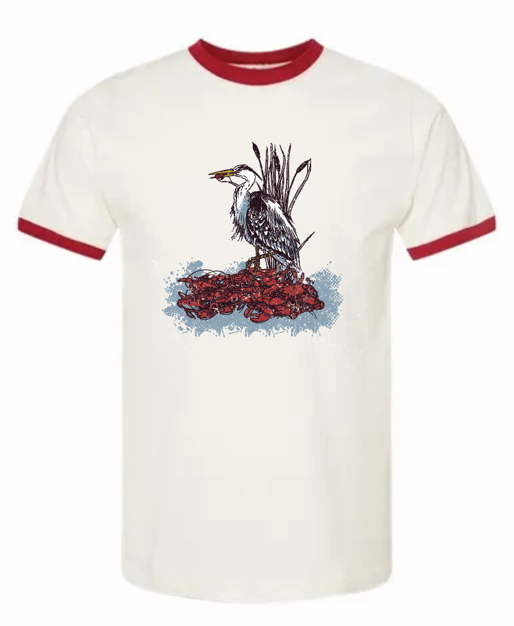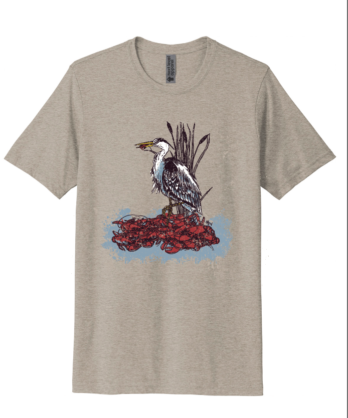 Rooted in Southern charm and outdoor tradition, the Bayou Catch Tee captures a quiet moment in the marshlands. Featuring a beautifully illustrated heron perched proudly atop a vibrant crawfish mound, this design blends rustic detail with bold color for a true statement piece.