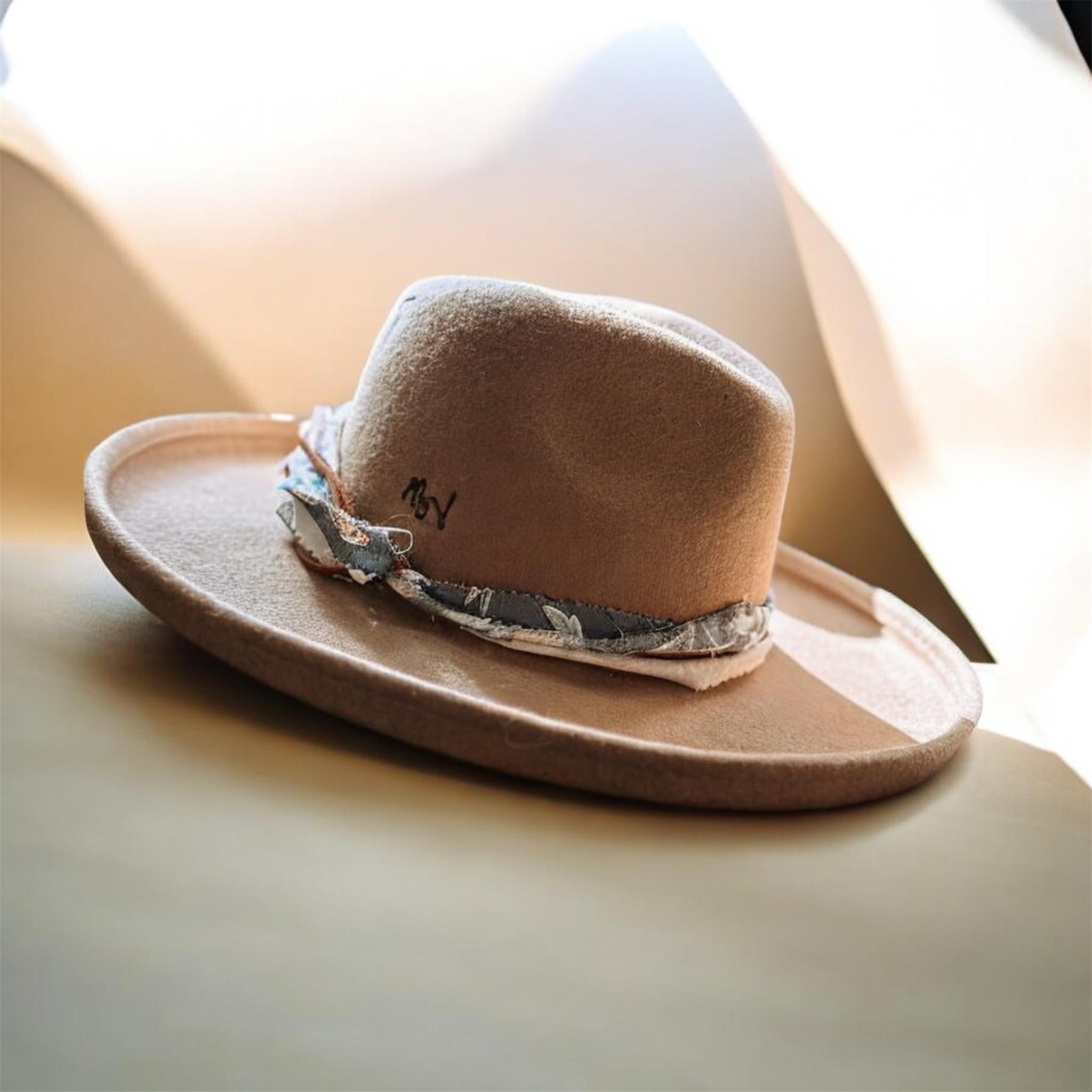 Each piece is carefully customized, giving it a unique, one-of-a-kind finish. The soft felt body is paired with a layered ribbon and leather accent band for added texture and detail.