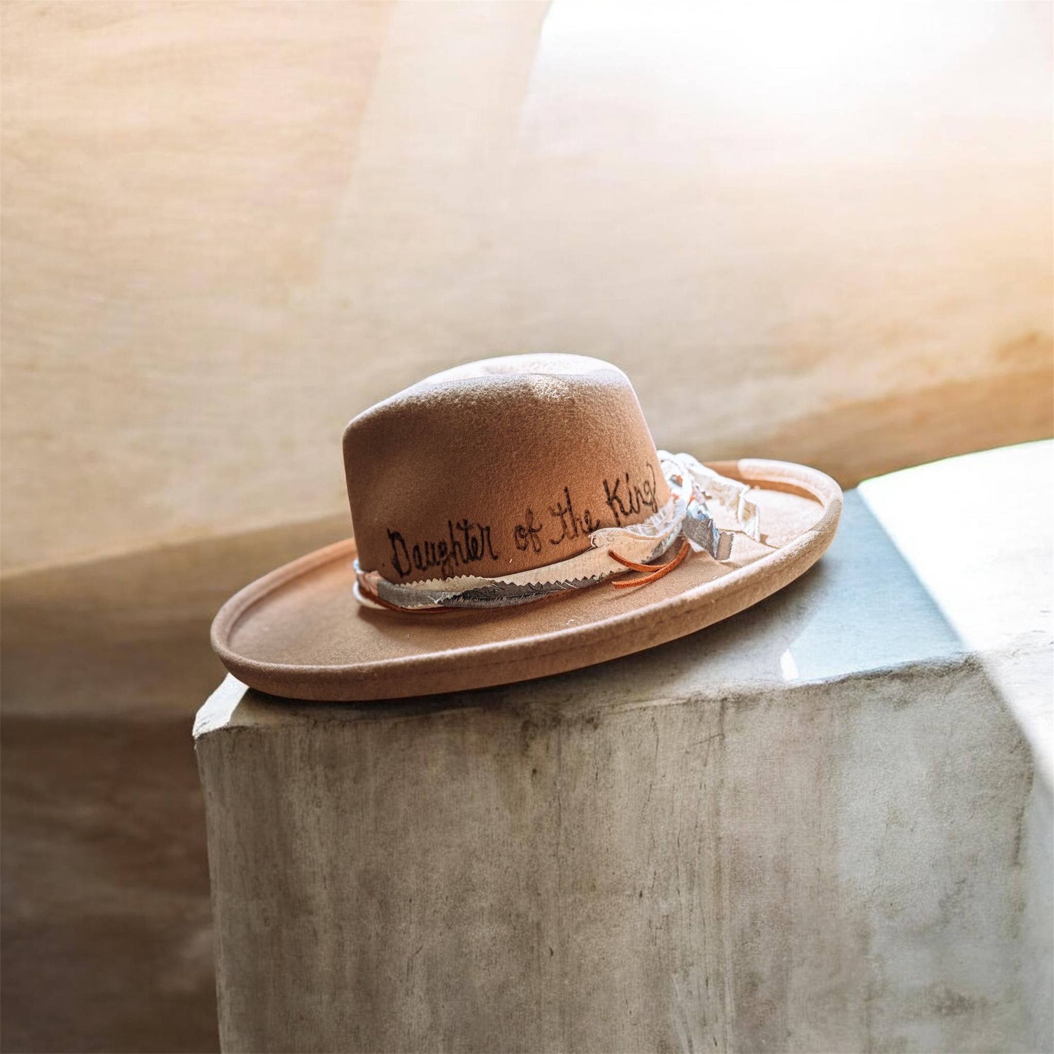 This custom hand-burned hat features the words “Daughter of the King” — a reminder of identity, strength, and whose you are. Designed in a warm neutral tone with a structured crown and flat brim, this hat blends western charm with timeless faith.